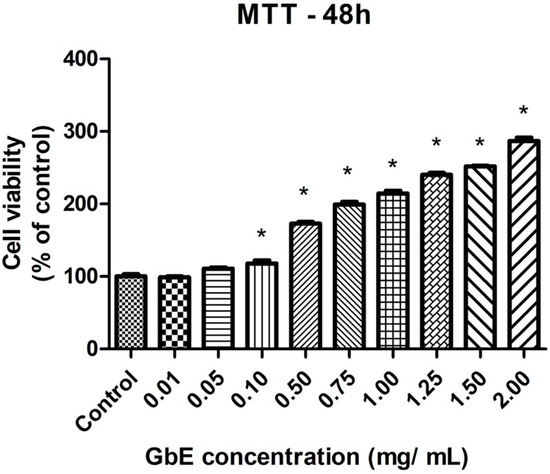 We evaluated the cytotoxicity of GbE in 3T3-L1 cells using MTT assay, demonstrating the absence of GbE cytotoxicity after 48 h. Furthermore, GbE treatment, in concentrations from 0.1 mg/mL to 2.0 mg/mL, significantly increased the percentage of viable cells compared to the control, which may indicate an increase in mitochondrial activity. Our data corroborate the findings reporting the absence of cytotoxicity for keratinocytes cells treated with GbE concentrations from 0.1 to 1.0% (1 mg/mL to 10 mg/mL) after 48 h [23]. The absence of GbE cytotoxicity up to 0.2 mg/mL in HaCaT keratinocytes cells was also reported, however, concentrations above 0.2 mg/mL were necessary to decrease cell viability by 50% (IC50), showing that the cell line can impact its viability after the treatment with GbE [24].