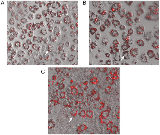 Representative confocal microscopy images (128× magnification) of 3T3-L1 cells after 7 days of differentiation stained with Oil Red O. (A) Control; GbE-treated at concentrations: (B) 0.75 mg/mL and (C) 1.00 mg/mL. Blank arrows represent lipids located inside adipocytes.