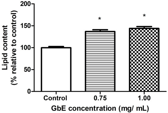 GbE increased the lipid content evaluated by Oil Red O staining after the treatment of 3T3-L1 cells with GbE in different concentrations (0.75 and 1.00 mg/mL) during the differentiation process (7 days), and control group. The values were normalized to the average of control group levels. Results are expressed as mean ± SEM (n = 6) from three independent experiments. One-way ANOVA followed by Dunnett’s post-test. * p < 0.05 vs. control.