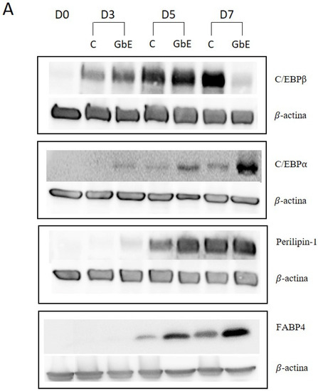 In order to perform a temporal evaluation of protein expression involved in 3T3-L1 preadipocytes differentiation (C/EBPβ and C/EBPα), and specific mature adipocytes proteins (Perilipin-1 and FABP4), all the markers were evaluated on day 0 (D0), day 3 (D3), day 5 (D5), and day 7 (D7) after differentiation induction, with or without GbE treatment at 1.0 mg/mL (Figure 4A).