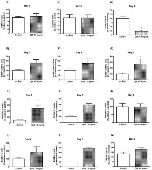 (A) GbE treatment stimulated adipocyte proteins during the differentiation process in 3T3-L1 cells analyzed by Western blotting. C/EBP- levels in control groups and treated with GbE for: (B) 3 days (n = 6), (C) 5 days (n = 6) and (D) 7 days (n = 5–6); C/EBPα levels in control groups and treated with GbE for: (E) 3 days (n = 5), (F) 5 days (n = 5), and (G) 7 days (n = 4–5). Perilipin-1 levels in control groups and treated with GbE for: (H) 3 days (n = 5–6), (I) 5 days (n = 6), and (J) 7 days (n = 6). FABP4 levels in control groups and treated with GbE for: (K) 3 days (n = 4), (L) 5 days (n = 3–4), and (M) 7 days (n = 4). The values were normalized to the average of control group levels. Results are expressed as mean ± SEM from two independent experiments. Student’s t-test. * p 0.05 vs. control.