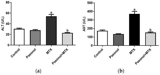 The effect of paeonol on the serum (a) alanine transaminase (ALT) and (b) aspartate transaminase (AST) in methotrexate (MTX)-induced hepatotoxicity in rats. Data are represented as mean ± SEM (n = 6). Letters a,b Denote significant differences from the normal control and the MTX groups, respectively, at p ˂ 0.05.