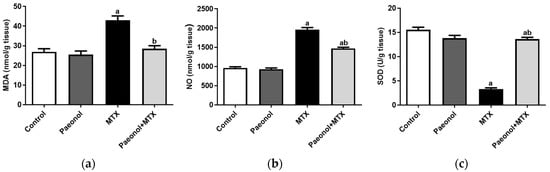 The effect of paeonol on hepatic (a) lipid peroxide malondialdehyde (MDA), (b) nitric oxide (NO), and (c) superoxide dismutase (SOD) in MTX-induced hepatotoxicity in rats. Data represent the mean ± SEM of 6 observations. Letters a,b Denote significant differences from the normal control and the MTX groups, respectively, at p ˂ 0.05.