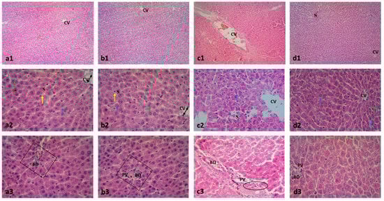 Photomicrographs showing the effect of paeonol on rat liver tissues stained with H&E in methotrexate (MTX)-induced hepatotoxicity (×100 and ×400). The tissue of the control group (a1) showed typical morphological features of hepatic cells with normal lobular architecture and normal central veins (CV). Similarly, the liver tissues of the paeonol group (b1) showed a normal hepatic structure. The liver tissues of both the control and paeonol groups (a2,b2) showed central veins (CV) which appeared to be lined by flat endothelial cells (double arrows), surrounded by cords of polygonal hepatocytes with granular cytoplasm and central, rounded, vesicular nuclei (blue arrows). Some cells appeared to be binucleated (green arrows). The blood sinusoids (S) are lined by Kupffer cells (yellow arrows). Additionally, the investigated liver tissues of the two groups showed branches of portal veins (PV) and bile ductules (BD) seen at a portal area (squares) (a3,b3). The liver tissues of the MTX-treated rats showed a disturbed lobular architecture with dilated central veins (CV) and blood sinusoids (S), and the cells have darkly stained nuclei with deeply stained cytoplasm (blue arrow) (c1,c2). Moreover, the liver tissues of the MTX-treated rats showed dilated bile ductules (BD) and a dilated portal vein (PV) surrounded by cellular infiltrations (circle) (c3). The microscopic examination of the liver tissues of the paeonol + MTX group showed a normal lobular architecture with apparently normal central veins (CV), except for a focal congested blood sinusoid (S) (d1). In the same group, the hepatocytes appeared to be polygonal with acidophilic cytoplasm and vesicular nuclei (blue arrow) (d2). Furthermore, the liver tissues of the paeonol + MTX group showed some binucleated cells (green arrow) and a few darkly stained nuclei with deeply stained cytoplasm (d2). In the same group, the portal vein (PV) and bile ductules (BD) have a normal appearance (d3).
