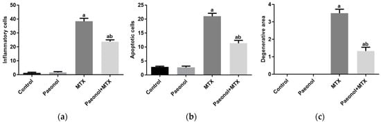 The effect of paeonol on the severity of histopathological lesions, (a) inflammatory cells, (b) apoptotic cells, and (c) degenerative area, in methotrexate (MTX)-induced hepatotoxicity in rats. Data are represented as mean ± SEM (n = 6). Letters a,b Denote significant differences from the normal control and the MTX groups, respectively, at p ˂ 0.05.