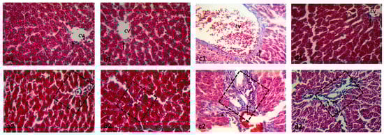 The hepatic tissues were dehydrated after fixation overnight in formalin using an ascending alcohol gradient. Tissues were cleared in xylene, rapidly embedded in paraffin, and 5-µm-thick sections were processed for hematoxylin–eosin or Masson trichrome staining. The stained sections were examined by light microscopy (Olympus CX23LEDRFS1, Olympus, Tokyo, Japan) to detect histopathological changes and collagen deposition.