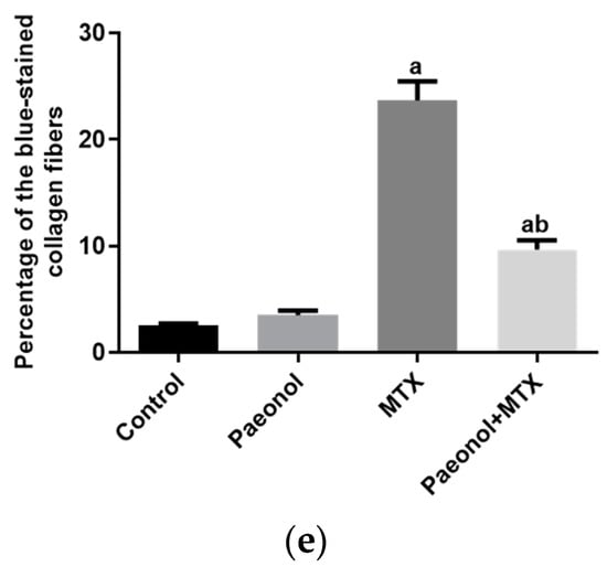 Masson’s trichrome stain in Figure 5 demonstrates the normal distribution of collagen fibers around central veins, and fine threads of collagen fibers were detected around the hepatic portal vein of control and paeonol groups. However, the untreated MTX group showed increased collagen fiber deposition between the hepatocytes and pericentral and periportal zones. The liver tissues of the paeonol + MTX group displayed a significant regression in the collagen fiber deposition in such areas (Figure 5).
