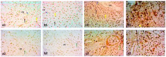 After deparaffinization and rehydration, the endogenous tissue peroxidase was blocked by hydrogen peroxide (3%, 5 min). Sections were incubated overnight with the primary antibodies against PCNA, iNOS, TNFα, P-gp, and Mrp-2. After washing in PBS for 5 min, biotinylated secondary antibodies were added for 30 min and washed with PBS for 3–5 min. Then, streptavidin-conjugated peroxidase was added for 35 min. The action of peroxidase on 3,3-diaminobenzidine (added for 5 min) produced a brown-colored product, which is proportional to the amount of original protein in the sample. Sections were countered-stained with hematoxylin [].
