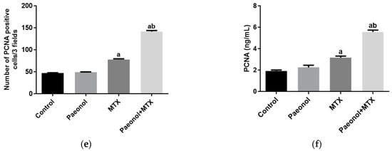 PCNA is essential in cell cycle regulation and DNA repair and replication []. PCNA expression has been used as a potential marker for the proliferative activity of the tissues, and it could be used as a biomarker for the diagnosis and prognosis of different malignant tumors [,]. In the current study, PCNA expression levels in the liver tissues of MTX-treated rats showed a significant increase compared to controls. These results may be attributed to the stimulation of hepatocyte proliferation as a compensatory reaction in response to the tissue damage caused by MTX administration []. Direct inhibition of DNA replication is usually associated with MTX therapy, and this may explain the MTX-induced depletion in PCNA expression observed by other studies [,,]. The variability in MTX treatment regimens could be a reasonable cause for these contradictory observations of the MTX effect on PCNA expression. Alternatively, the current results show that paeonol pretreatment in MTX-challenged rats revealed strongly positive PCNA staining reactivity of the hepatocyte nuclei, indicating improved cell renewal. The upregulation of PCNA contributes to cell proliferation and survival via promoting cell cycle progression and the reduction of apoptosis []. Previous studies have associated the protective effect of paeonol against the harmful effects of MTX with suppression of the reactive oxygen species, DNA fragmentation, and apoptosis [,]; thereby, explaining the ability of paeonol to reverse tissue damage and initiate cell proliferation to promote the healing of damaged tissues.