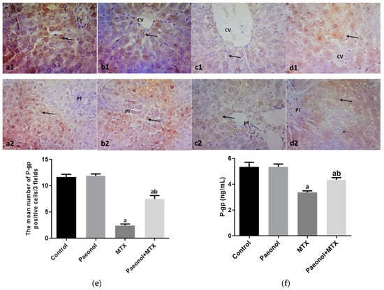 The immunohistochemical examination of hepatic P-glycoprotein (P-gp) expression in methotrexate (MTX)-induced hepatotoxicity (×400). The liver tissues of the control (a1,a2) and paeonol (b1,b2) groups show nuclear P-gp expression (arrows) in hepatocytes surrounding the central veins (CV) and portal areas (PT). The liver tissues of the MTX-treated rats show few nuclear P-gp expressions (arrows) (c1,c2). On the contrary, the liver tissues of the paeonol + MTX group show many nuclear P-gp expressions (arrows) in hepatocytes surrounding the CV and PT (d1,d2). A semi-quantitative analysis of P-gp positive cells (e). Hepatic P-gp level using P-gp ELISA kit (f). Data are represented as mean ± SEM (n = 6). Letters a,b Denote significant differences from the normal control and the MTX groups, respectively, at p ˂ 0.05.