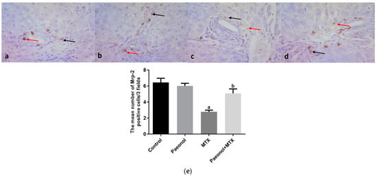The immunohistochemical examination of hepatic multidrug resistance-associated protein 2 (Mrp-2) expression in methotrexate (MTX)-induced hepatotoxicity (×400). The liver tissues of the control (a) and paeonol (b) groups show cytoplasmic (black arrows) and nuclear (red arrows) Mrp-2 expression in the portal tract cells, mainly in the cells of bile ductules. The liver tissues of the MTX-treated rats show little cytoplasmic (black arrow) and nuclear (red arrow) Mrp-2 expression in the previously mentioned cells (c). In contrast, the liver tissues of the paeonol + MTX group show marked cytoplasmic (black arrow) and nuclear (red arrow) Mrp-2 expression in the portal tract cells, mainly in the cells of bile ductules (d). A semi-quantitative analysis of Mrp-2 positive cells (e). Data are represented as mean ± SEM (n = 6). Letters a,b Denote significant differences from the normal control and the MTX groups, respectively, at p ˂ 0.05.