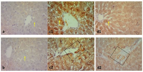 The immunohistochemical examination of hepatic inducible nitric oxide synthase (iNOS) expression in methotrexate (MTX)-induced hepatotoxicity (×400). The liver tissues of the control (a) and paeonol (b) groups show hepatocytes with faint cytoplasmic iNOS expression (yellow arrows). The liver tissues of the MTX-treated rats show hepatocytes with intense cytoplasmic iNOS expression (yellow arrow) (c1). Expression is also noticed in the portal area (square) (c2). In contrast, the liver tissues of the paeonol + MTX group show hepatocytes with little iNOS expression (yellow arrow) (d1). Little expression is also noticed in the portal area (square) (d2). A semi-quantitative analysis of iNOS positive cells (e). Data are represented as mean ± SEM (n = 6). Letters a,b Denote significant differences from the normal control and the MTX groups, respectively, at p ˂ 0.05.