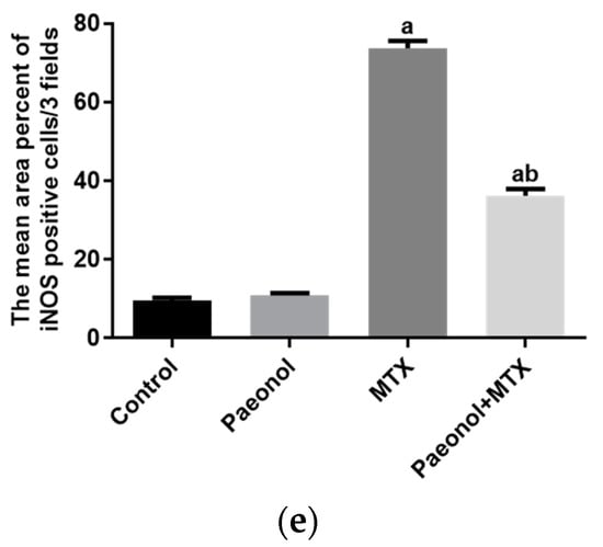 The hepatic protein expression of proliferating cell nuclear antigen (PCNA) was significantly increased (p < 0.05) in rats that received MTX in comparison with the control group (Figure 6). On the contrary, the hepatic expressions of P-gp and Mrp-2 measured in the MTX-challenged group showed significant downregulations (p < 0.05) compared with the control group. The hepatic expression of the previous markers was comparable in both control and paeonol groups. However, treatment with paeonol significantly increased (p < 0.05) PCNA, P-gp, and Mrp-2 expressions in the MTX-challenged rats compared to the non-treated MTX rats (Figure 6, Figure 7 and Figure 8). Additionally, we assessed the protein expression levels of iNOS and TNF-α (Figure 9 and Figure 10). The normal and control paeonol-treated hepatic tissues revealed negative iNOS and TNF-α immunohistochemical staining. The MTX-intoxicated group showed a significantly higher cytoplasmic expression for both parameters in the rat hepatocytes than in the control group, which was lowered considerably by paeonol treatment. Regarding hepatic PCNA, P-gp, and TNF-α, the same results were obtained using PCNA, P-gp, and TNF-α ELISA kits, respectively (Figure 6f, Figure 7f and Figure 10f).