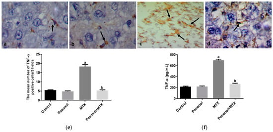 The immunohistochemical examination of hepatic tumor necrosis factor-α (TNF-α) expression in methotrexate (MTX)-induced hepatotoxicity (×1000). The liver tissues of the control (a) and paeonol (b) groups show Kupffer cells with TNF-α cytoplasmic expression (arrows). The liver tissues of the MTX-treated rats show many Kupffer cells with TNF-α cytoplasmic expression (arrows) (c). In contrast, the liver tissues of the paeonol + MTX group show few Kupffer cells with TNF-α cytoplasmic expression (arrow) (d). A semi-quantitative analysis of TNF-α positive cells (e). Hepatic TNF-α level using TNF-α ELISA kit (f). Data are represented as mean ± SEM (n = 6). Letters a,b Denote significant differences from the normal control and the MTX groups, respectively, at p ˂ 0.05.