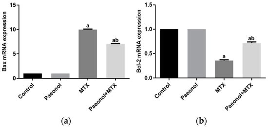 The effect of paeonol on hepatic mRNA expressions of Bax (a) and Bcl-2 (b) in methotrexate (MTX)-induced hepatotoxicity in rats. Data are represented as mean ± SEM (n = 6). Letters a,b Denote significant differences from the normal control and the MTX groups, respectively, at p ˂ 0.05.