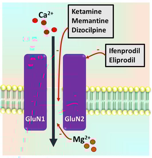 - Dravid, S.M.; Erreger, K.; Yuan, H.; Nicholson, K.; Le, P.; Lyuboslavsky, P.; Almonte, A.; Murray, E.; Mosely, C.; Barber, J.; et al. Subunit-specific mechanisms and proton sensitivity of NMDA receptor channel block. J. Physiol. 2007, 581, 107–128. [Google Scholar] [CrossRef]