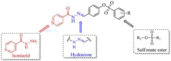 Due to their commonly reported anti-TB properties, hydrazone-possessing molecules are of considerable interest []. Particularly, the synthesis of hydrazone derivatives of the current anti-TB drugs such as isoniazid [], ciprofloxacin [], and pyrazinamide [] is a frequently applied antimycobacterial drug design strategy (Figure 2). Therefore, hydrazone is considered to be an excellent linker fragment for newly-designed antitubercular agents.