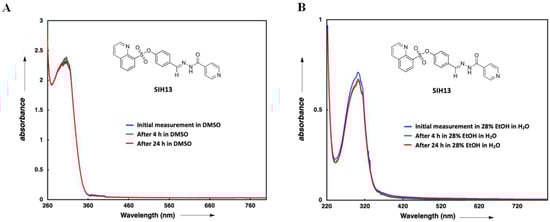 Accordingly, we performed stabilization tests for four selected compounds (SIH1, SIH4, SIH12, and SIH13) in both aqueous medium and DMSO by using UV/Vis spectroscopy. These representative compounds were selected based on their low MIC values against Mtb H37Rv strain. Samples with a concentration of 6.0 × 10–5 M were prepared in DMSO and a 28% ethanol-water mixture. The change in λmax values throughout 24 h in the selected solvents was monitored to assess the stability of the hydrazone functionality. As expected, no significant change in λmax values was observed for the compounds. UV/Vis absorption spectra of SIH13 in DMSO and ethanol-water are provided in Figure 4. The results for SIH1, SIH4, and SIH12 are reported in the Supplementary Material.