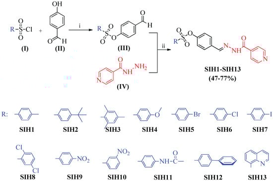 General procedure for the synthesis of the target compounds SIH1–SIH13: A mixture of appropriate 4-formylphenyl substituted benzenesulfonate (0.5 mmol) and isoniazid (0.5 mmol) was refluxed with 5 drops of acetic acid in 15 mL methanol for 8 h. After completion of the reaction, the mixture was cooled and the precipitated solid was filtered, dried, and recrystallized from methanol (SIH1-SIH7, SIH11-SIH13) or methanol-ether (8:2) (SIH8-SIH10) [].