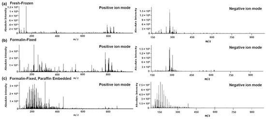 - Isberg, O.G.; Xiang, Y.; Bodvarsdottir, S.K.; Jonasson, J.G.; Thorsteinsdottir, M.; Takats, Z. The effect of sample age on the metabolic information extracted from formalin-fixed and paraffin embedded tissue samples using desorption electrospray ionization mass spectrometry imaging. J. Mass Spectrom. Adv. Clin. Lab 2021, 22, 50–55. [Google Scholar] [CrossRef]
