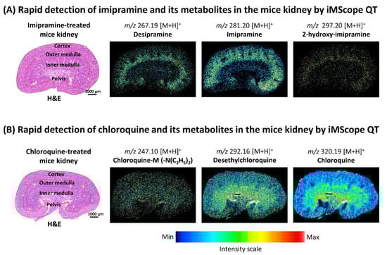 The following supporting information can be downloaded at: https://www.mdpi.com/article/10.3390/ph15111314/s1, Figure S1: MS spectra of imipramine and chloroquine acquired by DESI-QTOF, iMScope QT, and 7T SolariX FT-ICR at different speeds; Figure S2: Representative MS spectra acquired by DESI-QTOF and iMScope QT from sagittal sections of mice kidneys; Figure S3: Tandem MS (MS2) imaging of imipramine and chloroquine in treated mice kidneys by iMScope QT; Table S1: Metabolites of imipramine and chloroquine detected from treated-mice kidneys by DESI-QTOF and iMScope QT; Table S2: List of the metabolites of the imipramine and chloroquine detected from mice kidneys by DESI-QTOF and iMScope QT applying different data acquisition speeds; Figure S4: Ion images of imipramine, chloroquine, and their metabolites in the kidney of control mice applying DESI-QTOF and iMScope QT; Figure S5: Ion images of imipramine, chloroquine, and their metabolites in the brain of control mice applying iMScope QT; Table S3: Parameters used for the optimization and data acquisition by DESI-QTOF, Table S4: Parameters used for the optimization and data acquisition by iMScope QT.