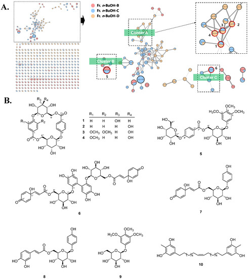 (A) LC-MS/MS molecular networking for the subfractions of the n-BuOH layer, and (B) chemical structures of compounds 1–10 isolated from the leaves of H. terminalis.