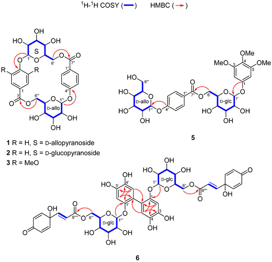 Key 1H−1H COSY and HMBC correlations for compounds 1–3, 5 and 6.