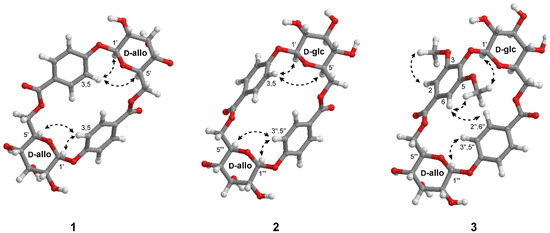 Compound 2 was obtained as a white amorphous powder, and it had the same molecular formula as that of 1 (C26H28O14) as deduced from the [M–H]− peak at m/z 563.1403 by HRESIMS (calcd for C26H27O14, 563.1401). The 1H and 13C NMR spectra of 2 (Table 1) exhibited two 4-hydroxybenzoyl group signals at δH 7.99 (d, J = 8.8 Hz, H-2, 6, 2H), 7.19 (d, J = 8.8 Hz, H-3, 5, 2H), 7.98 (d, J = 8.8 Hz, H-2″, 6″, 2H), and 7.18 (d, J = 8.8 Hz, H-3″, 5″, 2H) with carbon signals at δC 122.6 (C-1), 131.2 (C-2, 6), 115.8 (C-3, 5), 160.4 (C-4), 165.0 (C-7) and δC 122.5 (C-1″), 131.2 (C-2″, 6″), 115.8 (C-3″, 5″), 160.4 (C-4″), and 165.0 (C-7″) (Table 1). Additionally, two β-configured anomeric proton signals at δH 5.22 (d, J = 7.2 Hz, H-1′) and δH 5.37 (d, J = 8.0 Hz, H-1‴) appeared. Similar to compound 1, two 4-hydroxybenzoyl units and two hexapyranosyl moieties were found in the 1H and 13C NMR spectra of 2. However, the 26 carbon signals in the 13C NMR spectrum of 2 indicated that compound 2 is asymmetric, which means that the two hexapyranosyl groups should be different. The 1H−1H COSY analysis revealed that the two sets of hexapyranosyl signals in the 1H and 13C NMR spectra were β-allopyranoside and β-glucopyranoside (Figure 2 and Table 1). These results were further confirmed by comparison of the NMR chemical shifts with those reported [26,27,30]. The two sugar units were finally determined to be in the d-form through derivatization of the afforded sugar by acid hydrolysis of 2 [29]. The linkages of the two 4-hydroxybenzoyl groups, β-d-allopyranoside, and β-d-glucopyranoside were established by the observed HMBC correlations from H-1″ to C-4, from H-1‴ to C-4″, from H-6a′/H-6b′ to C-7″, and from H-6a″/H-6b″ to C-7″ (Figure 2). In the ROESY spectrum, cross-peaks of H-3, 5 with H-1′ and H-5′ and H-3″, 5″ with H-1‴ and H-5‴ appeared, indicating that 2 is a macrocyclic glycoside (Figure 3). Thus, the structure of 2 was elucidated as 4-({6′-O-[(4′′-O-β-d-allopyranosyl)hydroxy-benzoyl]-β-d-glucopyranosyl}oxy)hydroxyl-benzoic acid inner ester and named as heliciopside B.