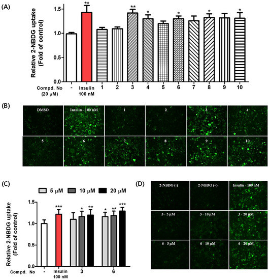 Stimulatory effects of compounds 1–10 on glucose uptake in 3T3-L1 adipocytes using a 2-NBDG. (A) 3T3-L1 adipocytes were incubated with insulin (100 nM) as a positive control and compounds 1–10 (20 μM) for 1 h with or without 2-NBDG. Glucose uptake was measured at Ex/Em = 450/535 nm using a fluorescence microplate reader. The results are presented as the means ± SDs (n = 3); each experiment was performed in triplicate. * p < 0.05, ** p < 0.01, and *** p < 0.001, compared to the negative control. (B) After differentiated cells were treated with 100 nM insulin and 20 μM test compounds after treatment for 1h at the presence or absence of 2-NBDG, each cell image was obtained with a fluorescence microscope. (C,D) Concentration−dependent effects of compounds 3 and 6 on glucose uptake in 3T3-L1 adipocytes. Cells were treated with these compounds at 10 and 20 μM or with 100 nM insulin. After 1 h of incubation, the fluorescence intensities images were obtained using fluorescence microscopy.