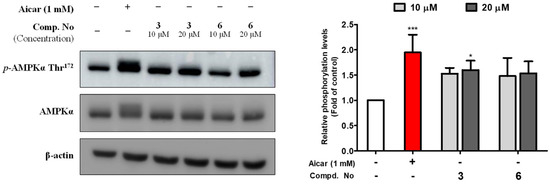 The effects of compounds 3 and 6 on the phosphorylation of the protein AMPK in differentiated C2C12 skeletal myoblasts. C2C12 cells were exposed to compounds 3 and 6 (10 and 20 μM) or Aicar (1 mM) for 1 h. The phosphorylation of AMPK was detected by Western blot assay. The values are presented as the means ± SDs (n = 3). * p < 0.05 and *** p < 0.001, compared to the negative control.