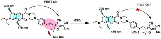 - Wu, W.; Wang, Z.; Dai, X.; Miao, J.; Zhao, B. An Effective Colorimetric and Ratiometric Fluorescent Probe Based FRET with a Large Stokes Shift for Bisulfite. Sci. Rep. 2016, 6, 25315. [Google Scholar] [CrossRef]