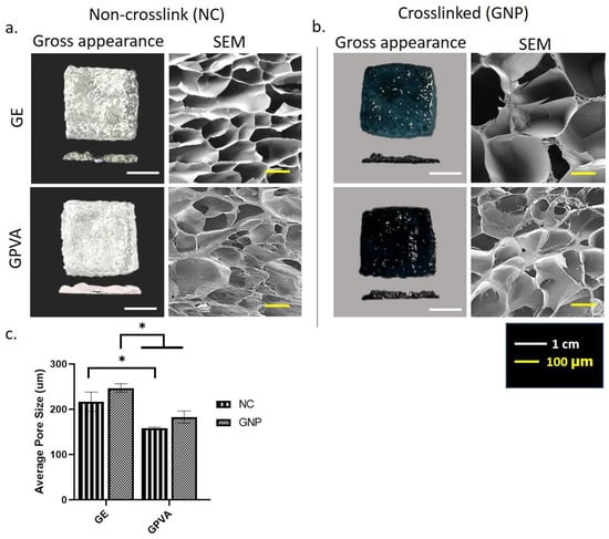 Gross appearance, cross-sectional microporous view and average pore sizes of single dermal layer hydrogel. (a) Gross appearance and SEM images of non-crosslink (NC) hydrogels. (b) Gross appearance and SEM images of crosslinked (GNP) hydrogels. (c) Average pore sizes of microporous hydrogels. * indicates p < 0.05.