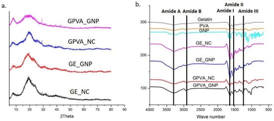 The chemical groups related with poly (vinyl alcohol) (OH, -CO, -CH2), and significant functional groups of the gelatin (amides I, II and III), are shown in the samples’ FTIR spectra in Figure 2b. The FTIR spectra for GE/PVA/GNP hydrogels were determined with wavenumbers between 600 and 4000 cm−1. It was found that the addition of PVA and GNP maintained the chemical structure of the gelatin. The presence of a broad band at 3287 cm−1 represented the stretching vibration of N-H (Amide A), while at 2923.7 cm−1 it indicated the presence of C-H stretching (Amide B). In addition, the peaks at 1631.23 cm−1, 1538.35 cm−1, and 1237.43 cm−1 were related to the presences of Amide I, Amide II, and Amide III of the gelatin. The distinct absorption peaks at 3304.25 cm−1 and 1915.31 cm−1 indicated the presence of O-H groups in GPVA_NC. Some minor alterations of peak at 1638.01 cm−1 can be seen in the spectra, which may have been caused by carboxyl group (C-O) stretching of the PVA.