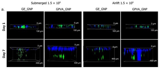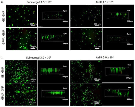 The cell viability of human dermal fibroblasts HDFs encapsulated in the bioinks were determined using a live/dead assay, as shown in Figure 3a,b. A high ratio of green-stained cells (>85%) was found in the printed hydrogels, indicating the presence of live cells. Comparing the results, based on different cell densities and cultivation states, the percentage of live cells was higher at 3.0 × 106 compared to 1.5 × 106 of cell densities for both submerged and air-lifting models. However, the air-lifting cultivation model seemed inadequate to provide a conducive environment to the HDFs, and the HDFs became smaller than those in the submerged model. According to the cell viability assessment in Figure 3c,d, the submerged model, with 3.0 × 106, showed higher cell viability in GPVA_GNP than in GE_GNP (96 ± 0.02% and 94 ± 0.05%), as compared to GE_GNP and GPVA5_GNP in the airlift model (88 ± 0.01% and 95 ± 0.01%). Meanwhile, the cell viability for 1.5 × 106 remained higher in the GPVA_GNP and GE_GNP submerged model (95 ± 0.04% and 87 ± 0.06%), as compared to GPVA_GNP and GE_GNP in the airlift model (95 ± 0.01% and 85 ± 0.02%).