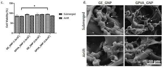 The cellular compatibility of the scaffolds with human dermal fibroblasts. (a) Live/Dead assay of HDFs for 1.5 × 106 of cell density. (b) Live/Dead assay of HDFs for 3.0 × 106 of cell density. (c) Cell viability of HDFs for 1.5 × 106 and 3.0 × 106 of cell density under submerged and air-lifting cultivation model. (d) HDF morphology encapsulated in the hydrogels (arrow pointed) observed using scanning electron microscopy (SEM) under submerged and air-lifting cultivation model (10× magnification). * indicates p < 0.05.