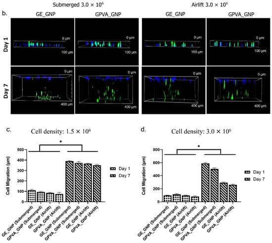 Cell migration assessments were used to determine the ability of the encapsulated HDFs to migrate throughout the pores of the printed hydrogels. The seeded HDFs on the 2D cell culture plate were dyed with a blue-coloured stain, while the encapsulated HDFs in the hydrogels were stained with a green cell tracker, as illustrated in Figure 4a,b. According to the results, the HDFs in both submerged and air-lifting models could migrate downwards in the matrix. As compared to different cell densities and cultivation models in Figure 4c,d, GE_GNP and GPVA_GNP submerged models, encapsulated with 3.0 × 106 of cell density, were revealed to have the highest cell migration rate at day 7 (590 ± 10 μm and 503.3 ± 15.2 μm), as compared to day 7 in the air-lifting model of GE_GNP and GPVA_GNP (293.3 ± 11.5 μm and 260 ± 10 μm), respectively. However, the same cell migration trend could be observed in the hydrogels encapsulated with 1.5 × 106 of cell density, in which submerged models of GE_GNP and GPVA_GNP (390 ± 5.0 μm and 373 ± 12.6 μm) migrated higher on day 7 as compared to the air-lifting model of GE_GNP and GPVA_GNP (366.7 ± 2.8 μm and 350 ± 10 μm).