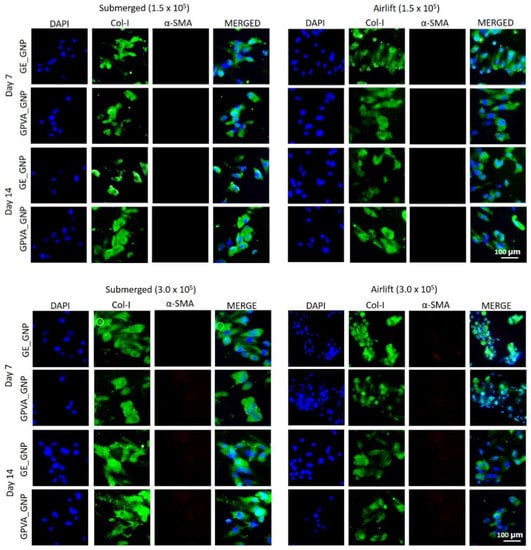 Collagen type-I (Col-I) is recognized as an essential marker that helps identify fibroblasts’ presence. The immunocytochemistry results in Figure 5 show that the expression of Col-I was strongly expressed in both submerged and air-lifting cultivation models under different cell densities (1.5 × 106 and 3.0 × 106) with the absence of alpha-smooth muscle actin (α-SMA).