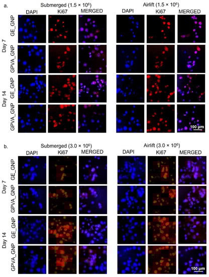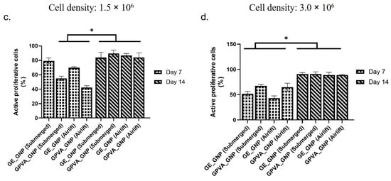 Cell proliferation activity is one of the main hallmarks during the proliferative phase of tissue repair and wound healing processes. The encapsulated HDFs were stained with Ki67 antibody to determine the active proliferative nucleus of HDFs. As shown in Figure 6a,b, there were clearly a higher proportions of Ki67 stained cells in both GE_GNP and GPVA_GNP under different cultivation models and cell densities. According to Figure 6c, there was a significant difference between the proportion of active proliferative nuclei of HDFs encapsulated in the hydrogels under different cell densities (1.5 × 106 and 3.0 × 106), and cultured in both submerged and air-lifting models from day 7 until day 14. Figure 6c demonstrates that the number of active proliferative cells of GE_GNP and GPVA_GNP increased in the submerged model from day 7 (79.3 ± 4.0% and 55 ± 3.0%) until day 14 of incubation (83.7 ± 7.5% and 89.7 ± 4.5). However, as compared to the air-lifting model, the number of active proliferative cells was slightly reduced in GE_GNP and GPVA_GNP, but still maintained the same increasing trend of proliferation from day 7 (69.7 ± 1.53% and 42.3 ± 2.5%) to day 14 (86.7 ± 2.9% and 84.0 ± 6.2%). Meanwhile, Figure 6d indicates the results for Ki67 GE_GNP and GPVA_GNP hydrogels, encapsulated with 3.0 × 106 cell density, which showed a similar increasing trend in the submerged model from day 7 (51.7 ± 4.5% and 67.7 ± 2.5%) to day 14 (91.0 ± 2.6% and 91.3 ± 4.1%), and, for the airlift model, from day 7 of incubation (43.0 ± 4.5% and 65.0 ± 7.8%) until day 14 (89.0 ± 5.2% and 90.3 ± 2.5%).