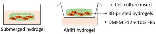 To prepare 5% (w/v) of PVA solution, Polyvinyl Alcohol (PVA) powder (partially hydrolysed with Mw 70,000 g/mol; MERCK KGaA, Darmstadt, Germany) was dissolved in distilled water for 1 h with mild magnetic stirring at 60 °C. Next, 6% (w/v) of gelatin powder ((Nitta-Gelatin Ltd. (Osaka, Japan) was added into the PVA solution and stirred at 40 °C until the solution became homogenous. The genipin (GNP) powder (FUJIFILM Wako Pure Chemical Corporation, Chuo-Ku, Osaka, Japan) was dissolved by vortex in 70% of ethanol solution to achieve 0.1% (w/v) solution. Finally, the GNP solution was mixed into gelatin–PVA solution at 40 °C and stirred for 10 min to allow crosslinking and obtain the final formulation of GE_NC and GPVA_NC for non-crosslinked, and GE_GNP and GPVA_GNP for crosslinked, hydrogels. A computer-controlled extrusion bioprinter (Biogens X1) from 3D Gens; 3D Bioprinting, Shah Alam, Malaysia was utilised to create a mesh structure for the current study. The printed hydrogels were then placed into two different culture environments (submerged and airlifted), as illustrated in Figure 7.