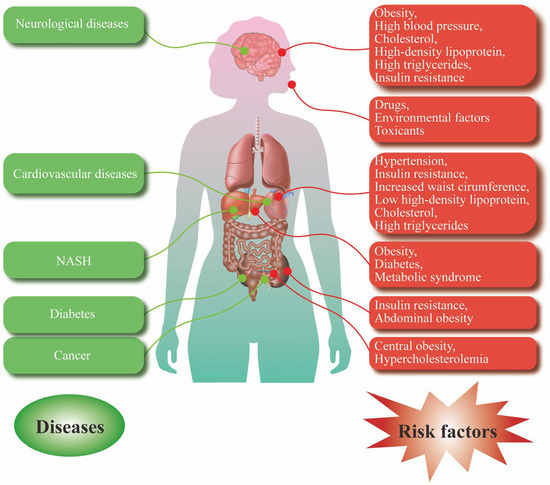 Figure 3. Common risk factors and various metabolic diseases. Risk factors for neurological disorders include obesity, high blood pressure, HDL-C, and high TG and IR. Risk factors for CVD include hypertension IR, increased waist circumference, low HDL, HDL-C, and high TG. Risk factors for NASH include obesity, diabetes, and MetS. Risk factors for diabetes include IR and abdominal obesity. Risk factors for cancer include central obesity and hypercholesterolemia. At the same time, drugs and environmental toxins can also affect human health from the respiratory tract and cause a series of metabolic diseases.