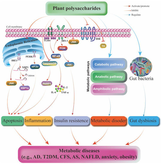 Currently, with the improvement in quality of life, an increasing number of people tend to choose natural medicines, especially plant-based supplements, for the prevention and treatment of diseases [4,5]. Polysaccharides are a kind of component that can be widely found in different plant species, and the structures comprise a variety of monosaccharides linked by glycoside bonds. Numerous studies indicate that plant polysaccharides (PPS) show multiple functional activities, mainly including immunity regulation and antitumor, anti-inflammatory, antivirus, antiradiation, and hypoglycemic effects. Most importantly, in vivo experiments have demonstrated that most PPS are relatively nontoxic and have few side effects [6]. Recently, many PPS have been widely studied in the potential treatment of metabolic diseases. For example, Aloe polysaccharides (APs) improve diabetes by activating the PERK and IRE1 pathways [7]. Angelica sinensis polysaccharides(ASPs) exert a neuroprotective effect in Alzheimer’s disease (AD) by regulating the Aβ25-35 neurotransmitter balance, free radiation metabolism, inflammation, and neuronal apoptosis [8]. In addition, Poria cocos polysaccharides (PCPs) improve atherosclerosis (AS) by regulating blood lipid levels, decreasing malondialdehyde (MDA) levels, and increasing superoxide dismutase (SOD) activity [9]. Although many kinds of PPS have shown positive effects in lowering blood sugar and blood pressure and protecting the liver and heart [10], there are still problems, such as poor targeting, poor stability, rapid blood clearance rate, and unconcentrated scope of action, which seriously affect bioavailability and clinical application [11,12]. In this review, we introduce the common characteristics and functional activity of PPS. In addition, the common risks and molecular mechanism of metabolic diseases are emphasized, and the pharmacological activity and mechanism of action of several representative PPS in metabolic diseases are summarized and discussed. Finally, this review should provide directions for future research of PPS in metabolic diseases.