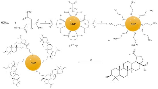 Betulinic acid (3β-hydroxylup-20(29)-en-28- oic acid, BA) is a lupane-type pentacyclic triterpene isolated almost 100 years ago from Gratiola officinalis [] which captured the interest of researchers once its selective anti-melanoma activity was reported by Pisha et al. in 1995 []. BA displays a remarkable plethora of biological effects that justify the intense work conducted worldwide in order to identify feasible options for its use as a therapeutic agent; it was the subject of a phase I/II clinical trial in the form of topical application against dysplastic nevi, but the study was discontinued without publishing any results []. BA can bind directly to target receptors, while some of the underlying mechanisms of the BA antitumor effects include the activation of mitochondrial pathways resulting in apoptosis, cell cycle regulation and antiangiogenic activity []. Of note, BA lacks systemic toxicity while inducing only slight photosensitive effects in experimental mice; therefore, the combination of strong pharmacodynamic properties with a low toxicological profile makes triterpenic acid a very promising alternative as an anticancer agent. However, in order to be able to enter the therapeutic arsenal, BA must meet specific requirements related to bioavailability, which is diminished by the compound’s low water solubility, a common issue for pentacyclic triterpenes [,,]. Different options have been addressed to overcome this obstacle, either through the design of semisynthetic derivatives [] or through various formulations; the latter approach covers a wide range of possibilities, such as co-crystals [], cyclodextrin complexation [], nanoformulations [], etc. Among the huge range of nanoformulations, metallic nanoparticles (NPs) have attracted a lot of interest due to their multiple advantages, such as small sizes that enable their penetration through biological membranes as well as the possibility of tuning their surfaces in order to achieve optimized pharmacokinetic properties [].