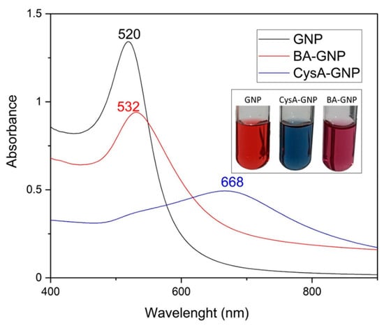 GNP exhibits surface plasmon resonance (SPR), a characteristic property that allowed researchers to achieve a deeper understanding of how the size, shape and uniformity of the nanoparticle sample impacts its UV-VIS spectra. Based upon this knowledge, they subsequently developed various methods to demonstrate how changes in the UV-VIS spectra of GNP are directly correlated with changes in nanoparticle shape, size and concentration [,]. The formation of GNP by the citrate reduction method was confirmed by UV-VIS spectroscopy. GNP exhibited the characteristic maximum absorbance peak at 520 nm (Figure 2). While cysteamine addition to the GNP suspension instantly produced a rapid color change to blue and a drastic blue shift in the UV-VIS spectra (Figure 2), the BA functionalization of GNP reverted the color of the nanosuspension to purple. Blue shift changes in the SPR maximum of GNP can be correlated with a decrease in overall nanoparticle size, surface functionalization, or an increase in size dispersity [,]. The recorded UV-VIS spectra of BA-GNP (Figure 3) revealed a blue shift compared to GNP and a red shift compared to intermediate cysteamine-functionalized gold nanoparticles (CysA-GNP). While these changes demonstrate that the functionalization reaction with BA occurred, the spectra also indicate that, in addition to the surface change, an increase in particle size and dispersity may have occurred in the BA-GNP.
