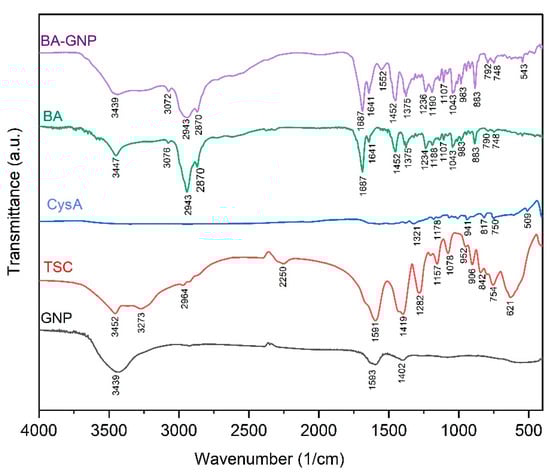 FTIR spectra of BA-GNP, BA, cysteamine (CysA), trisodium citrate (TSC) and citrate-GNP.
