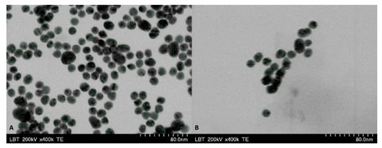 TEM analysis revealed stable spherical GNP particles with diameters ranging from 14 to 20 nm (Figure 4). BA-GNP TEM analysis revealed that BA functionalization of GNP had no effect on the shape or diameter of the BA-GNP. However, DLS experiments conducted in aqueous media at neutral pH revealed that BA-GNP increased in hydrodynamic size and had a slightly higher polydispersity index (PDI). The calculated DLE% for BA was approximately 31%, while the recorded ξ potential for both types of assessed nanoparticles was roughly similar (Table 1). The gold content for both samples was determined using X-ray fluorescence (XRF) analysis. Results showed that citrate GNP contains 274,315 ppm of elemental Au, which corresponded to roughly 27.4%, while the Au content for BA-GNP was approximately 14.6%. Both samples also showed traces (<1%) of Na, Si and other metals (Table 2).