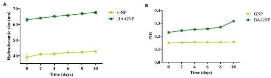 Time course changes of GNP and BA-GNP in (A) hydrodynamic size and (B) polydispersity index (PDI) stored at room temperature for a 10-day period.