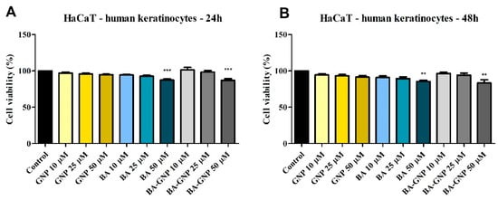 Cell viability of HaCaT cells after 24 h (A) and 48 h (B) treatment with GNP (diluted to match the same gold content as for BA loaded NPs at 10, 25 and 50 μΜ), BA and BA-GNP (10, 25 and 50 μΜ). The results are expressed as cell viability percentage (%) normalized to control (100%). The data represent the mean values ± SD of three independent experiments performed in triplicate. The statistical differences vs. control was determined using one-way ANOVA analysis followed by Tukey’s multiple comparisons post-test (** p < 0.005 and *** p < 0.0001).