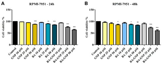 Cell viability of RPMI-7951 cells after 24 h (A) and 48 h (B) treatment with GNP (diluted to match the same gold content as for BA loaded NPs at 10, 25 and 50 μΜ), BA and BA-GNP (10, 25 and 50 μΜ). The results are expressed as cell viability percentage (%) normalized to control (100%). The data represent the mean values ± SD of three independent experiments performed in triplicate. The statistical differences vs. control was determined using one-way ANOVA analysis followed by Tukey’s multiple comparisons post-test (* p < 0.05, ** p < 0.005 and *** p < 0.0001).