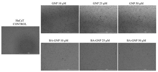 Representative images of the morphological aspect of HaCaT cells after treatment for 24 h with GNP (diluted to match the same gold content as for BA-loaded NPs at 10, 25 and 50 μΜ) and BA-GNP (10, 25 and 50 μΜ). The scale bar was 100 μm.