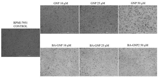 After 24 h stimulation with GNP (50 μM) and BA-GNP (10, 25 and 50 μM) the results showed that GNP at low concentrations (10 and 25 μM) had no detectable effects on the morphology of RPMI-7951 cells (Figure 4). However, a significant modification in cell morphology (shrinking and shape changes), as well as cell debris and detached cells, was detected at higher concentrations of GNP (50 μM) and for all tested concentrations of BA-GNP (Figure 9); these results suggest their cytotoxic effect against melanoma cells.